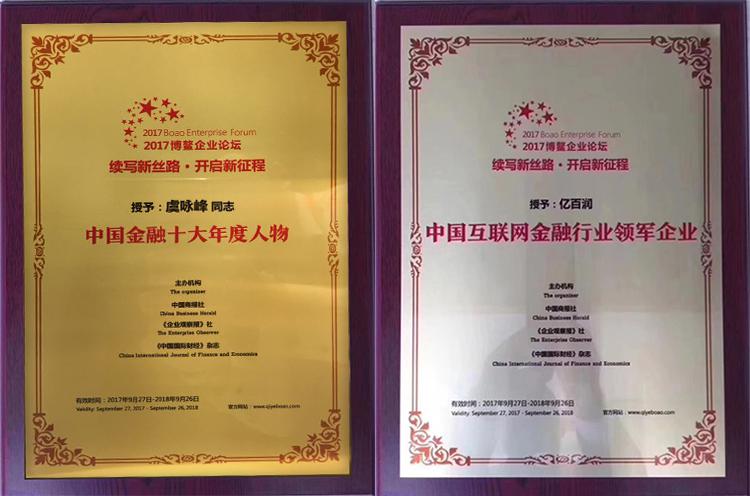 本次中国企业博鳌论坛上,亿百润喜获两项殊荣,企业被授予“中国互联网金融行业领军企业”称号,亿百润CEO虞咏峰获评“中国金融十大年度人物”。沉甸甸的奖项,体现了业界及广大用户对亿百润的认可,也是对亿百润开拓创新、稳健发展的一份赞誉。